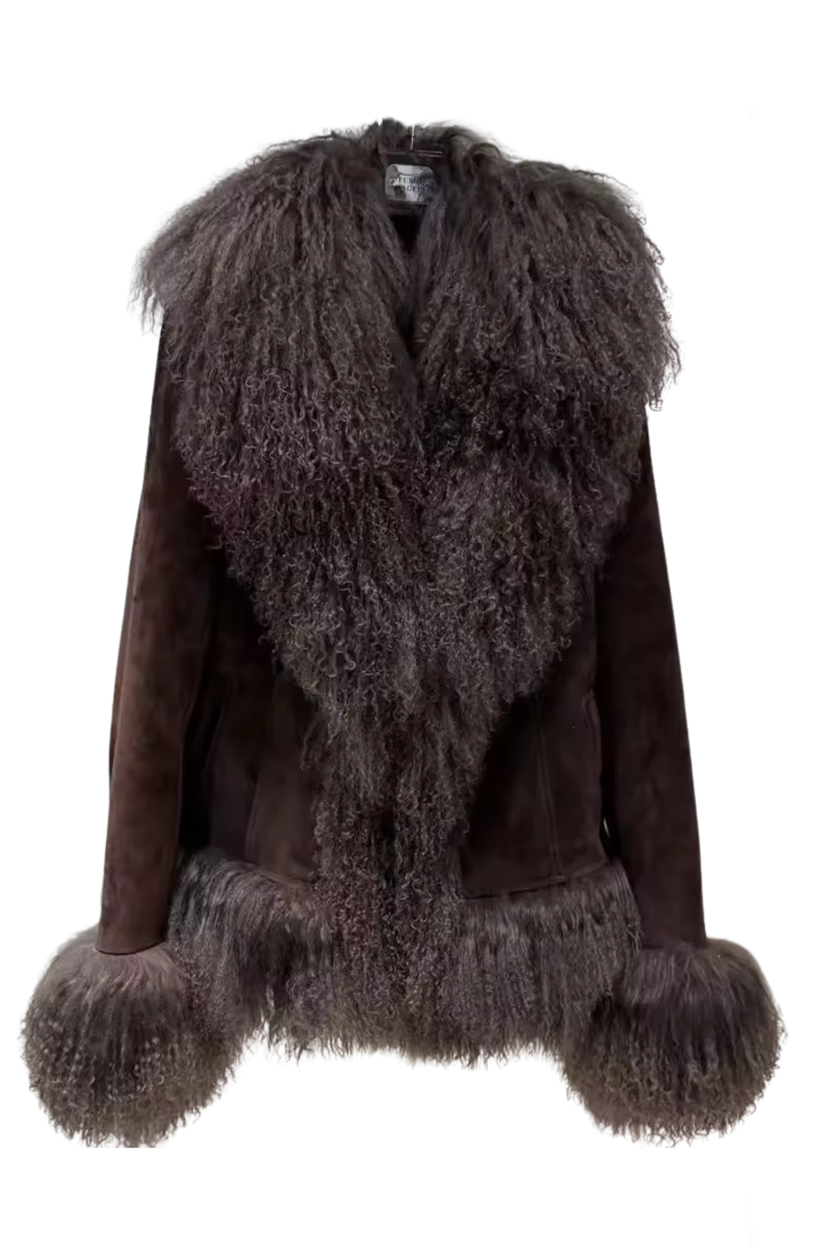 Questa giacca in camoscio e  Mongolia è il perfetto mix tra lusso e versatilità. Il morbido colletto in shearling e le tasche esterne lo rendono adatto ad ogni occasione, dal vestito elegante ai jeans casual.