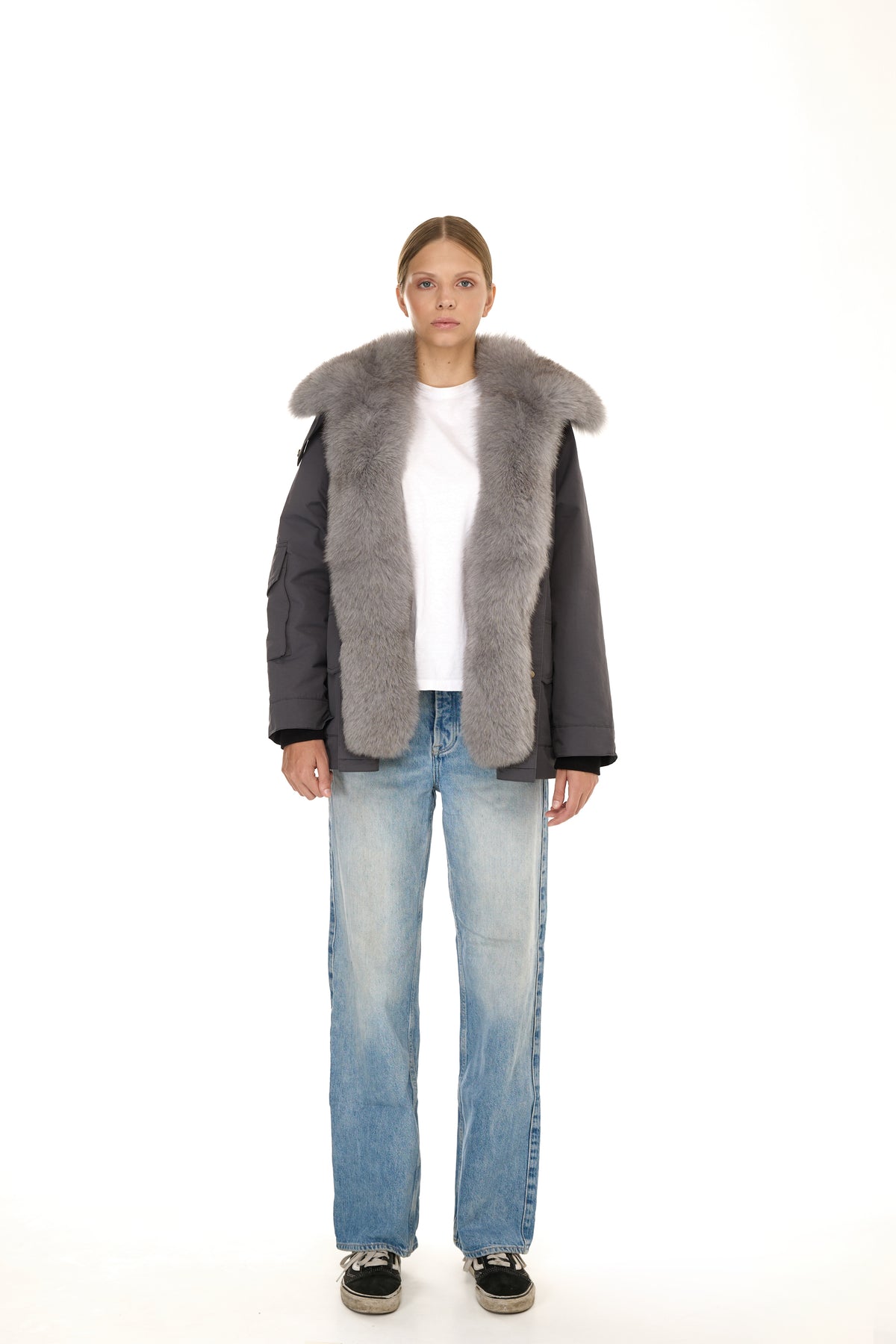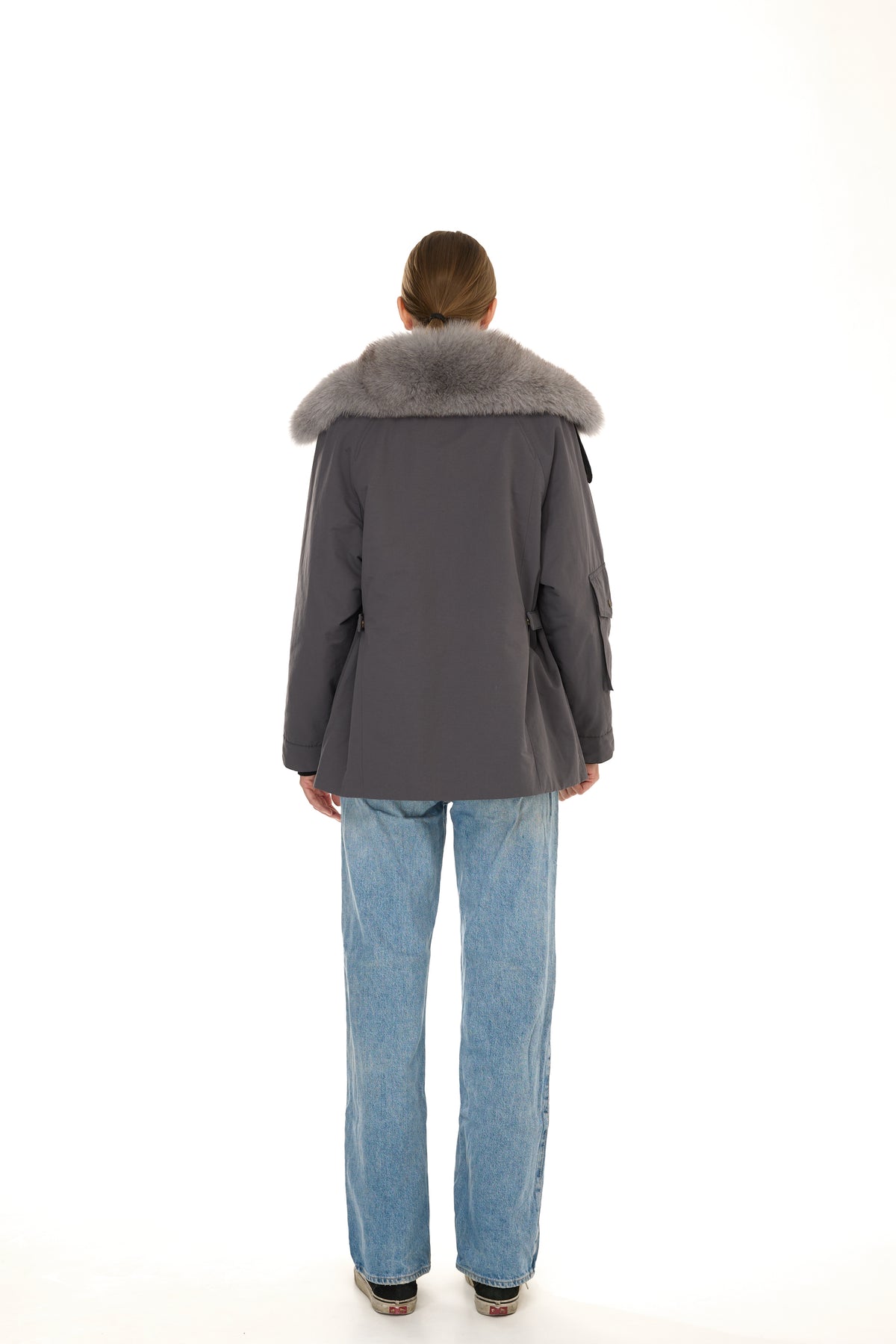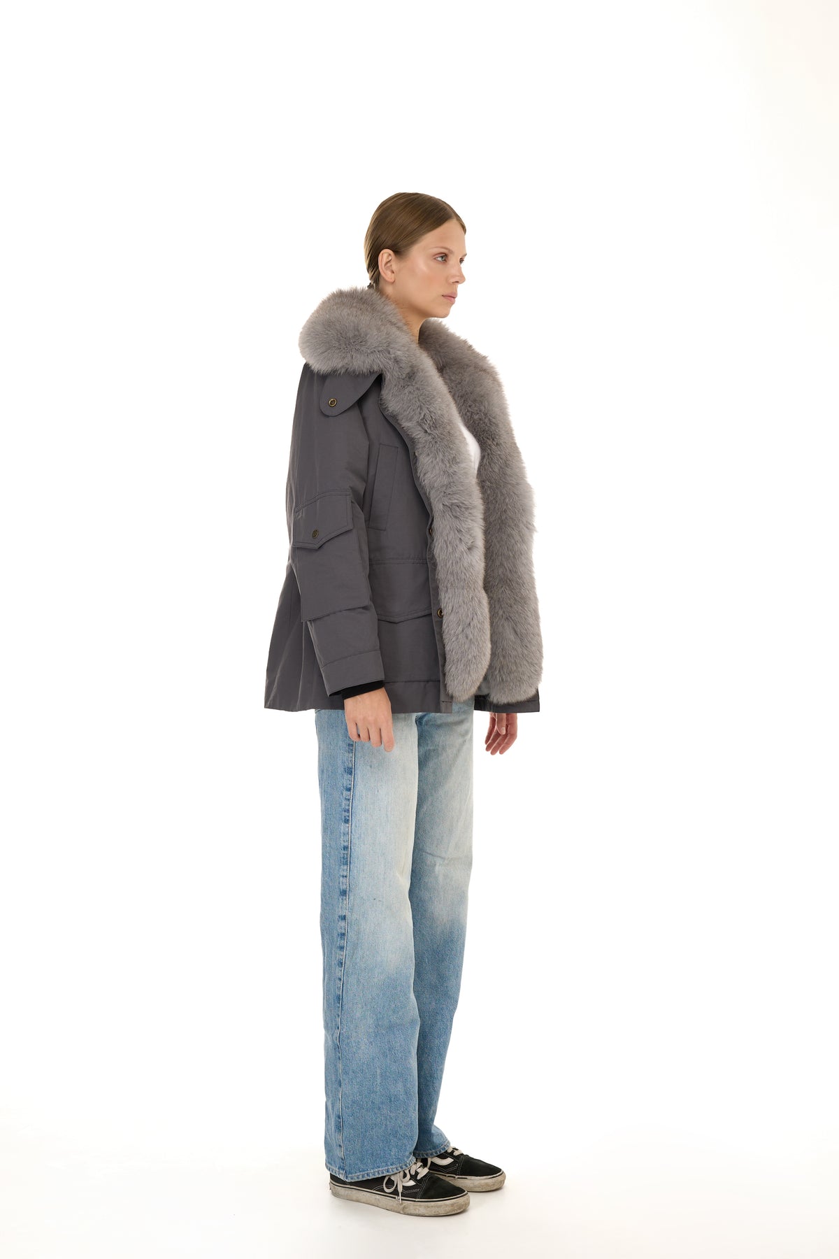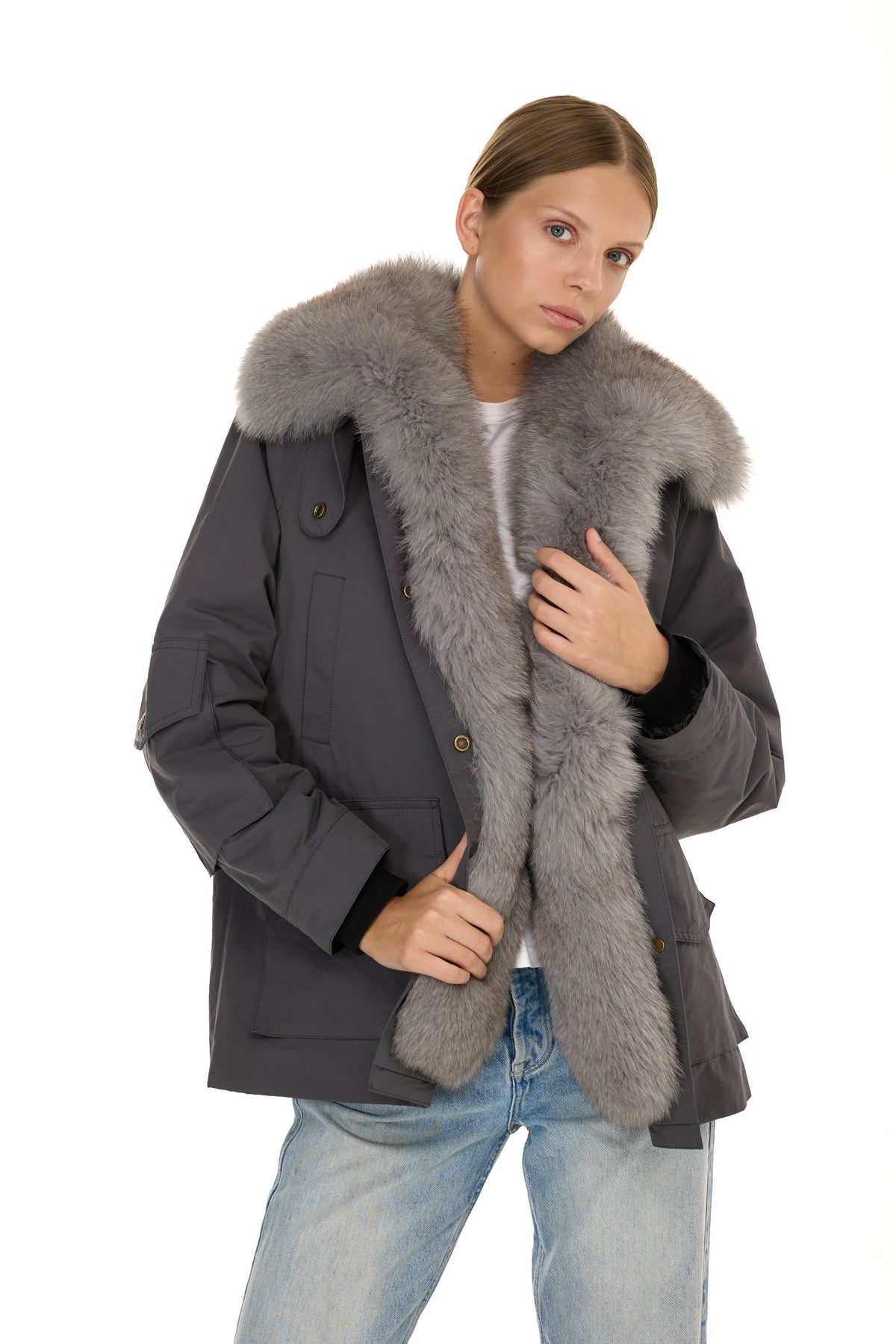 All’interno, la fodera in vera pelliccia di Rex Rabbit garantisce calore e morbidezza eccezionali. A impreziosire il capo, inserti in volpe posizionati sui frontali interni e sul collo posteriore, per un tocco raffinato e inaspettato che valorizza l’intero design.